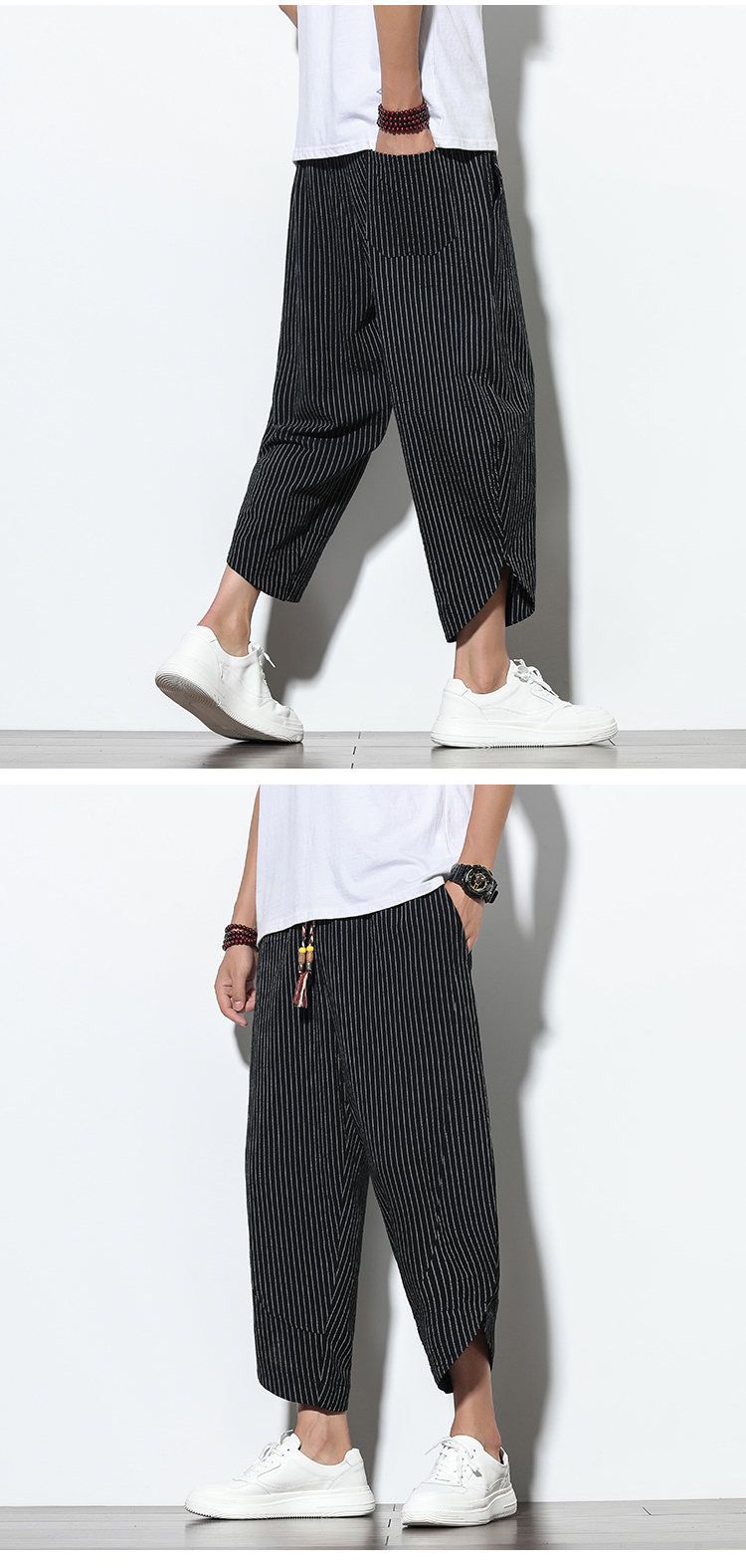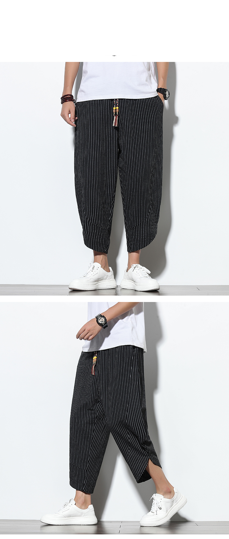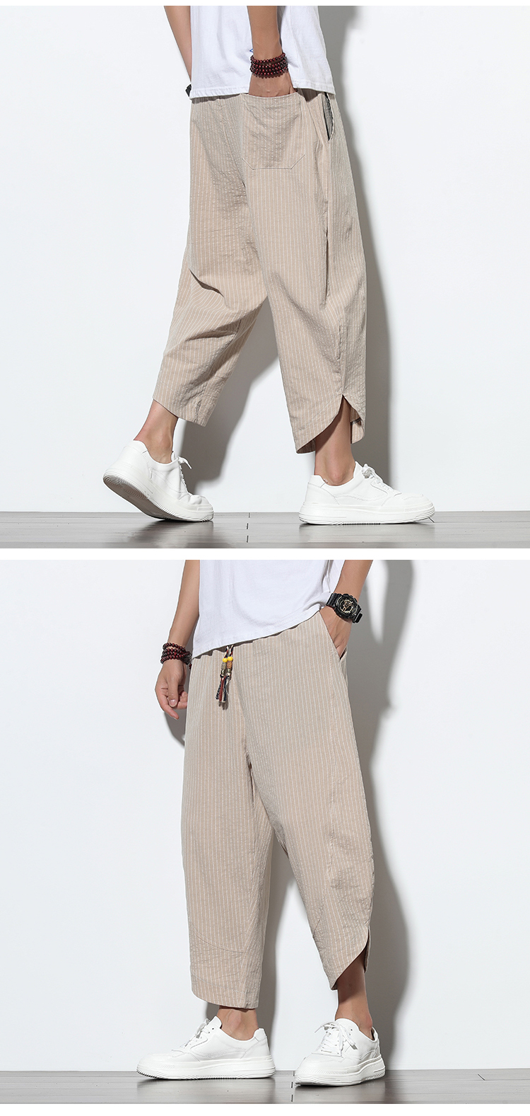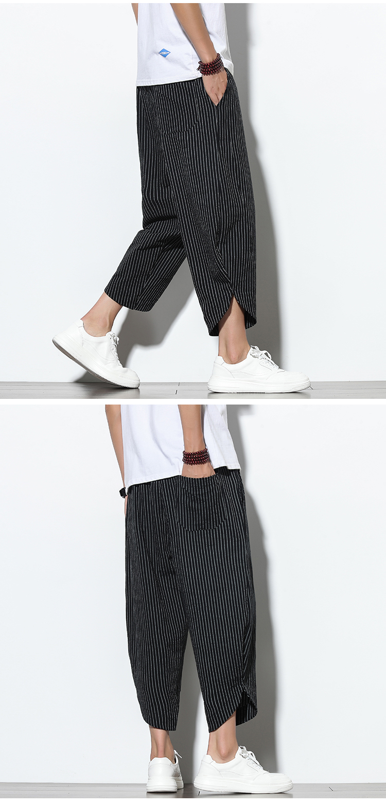 夏のゆったりリネンワイドパンツ メンズ・ルーズ・ワイド・レッグ・パンツ セブンポイント・ワイドパンツ ストライプのワイドパンツ